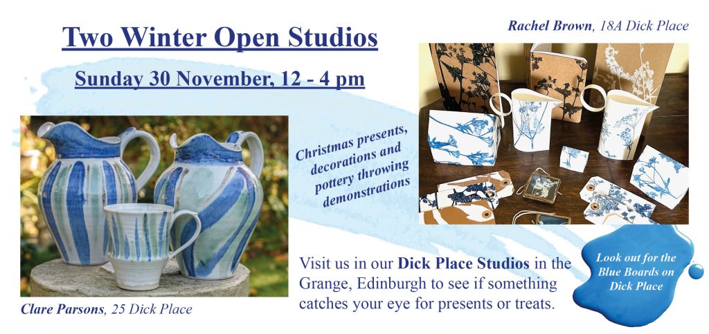 Join me on Sunday 30 November from 12-4pm for a cosy open studio: browse my botanical prints, Christmas decorations and gift ideas. And pop along to my neighbour at no. 25 to enjoy beautiful pottery and throwing demonstrations.